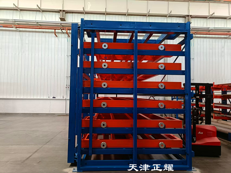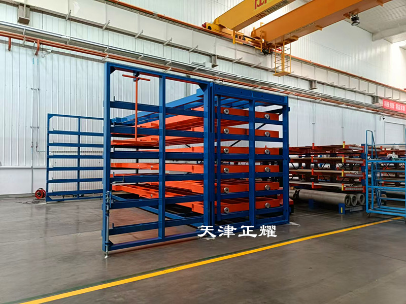 板材貨架每層抽屜對應(yīng)一種板材,不僅分類清晰,而且存取時無需翻動其他板材,大大節(jié)省了查找時間。抽屜可以單人單手搖出,操作簡便,即便是重型板材也能輕松應(yīng)對。搖出后,板材部分伸出,便于吊車直接吊裝到使用地點,整個過程省時省力,有效提升了工作效率。