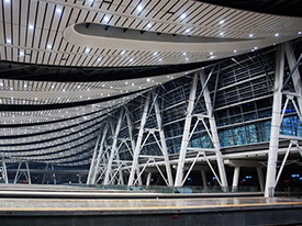 北京南站站房為雙曲穹頂,最高點(diǎn)標(biāo)高40.0米,檐口高度20.0米;兩側(cè)雨棚為懸索形鋼結(jié)構(gòu)最高點(diǎn)31.5米,檐口高度16.5米。地上部分長(zhǎng)軸500米,短軸350米;地下部分長(zhǎng)軸397.1米,短軸332.60米